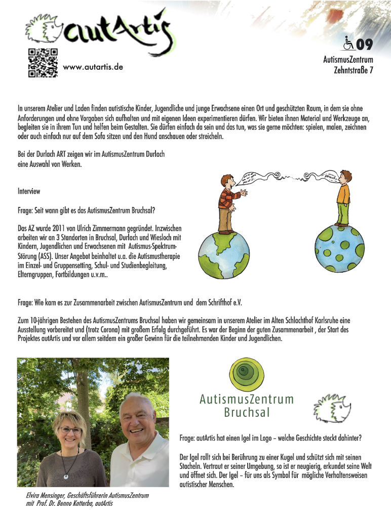 Wir sind eingeladen, die Bilder und Werke der Kinder und Jugendliche in der Depondence des Autismuszentrums Bruchsal in Durlach in der Zehnstraße 7 zu zeigen. Im Rahmen des Projektes autArtis haben sie in den letzten 3 Jahren in vielen Bildern und handwerklichen Arbeiten gezeigt, wie sie die Welt sehen, was sie interessiert, mit welchen Themen sie sich auseinandersetzen.